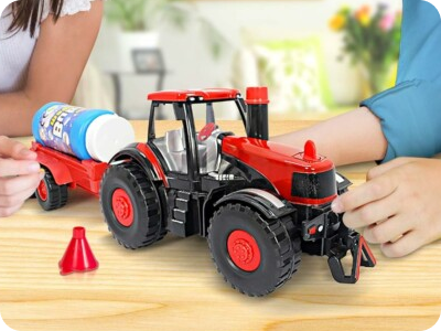 Комплектът включва: трактор, захранван от батерии, разглобяем вагон, бутилка за балончета, въже