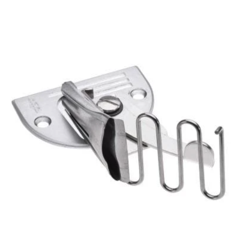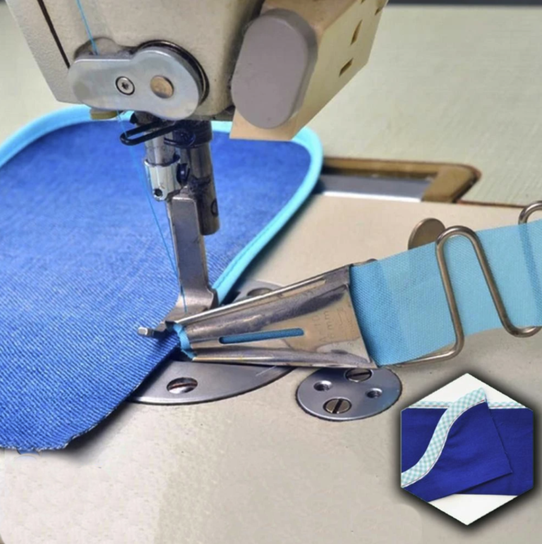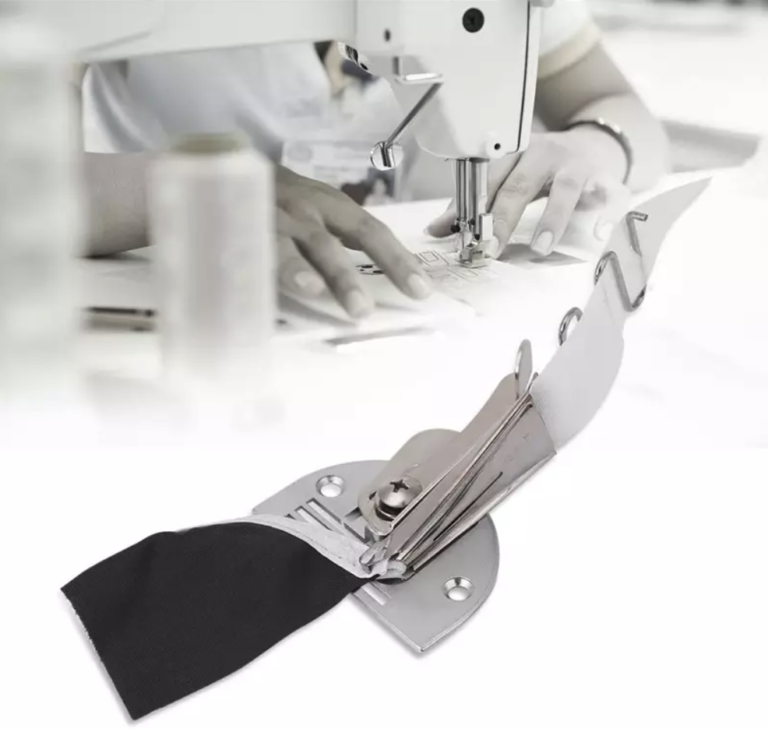 Този инструмент за подгъви поставя перфектно сгънат лентов материал върху яките, ръкавите и долната част на трикотажни топове.