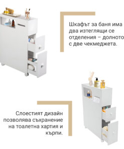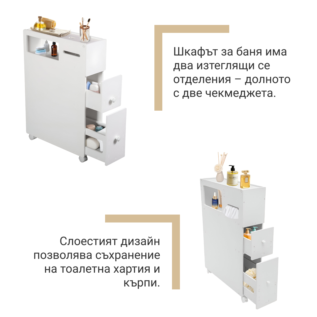 • Организирано Съхранение: Поддържайте ред в основните елементи на банята с отделни отделения.