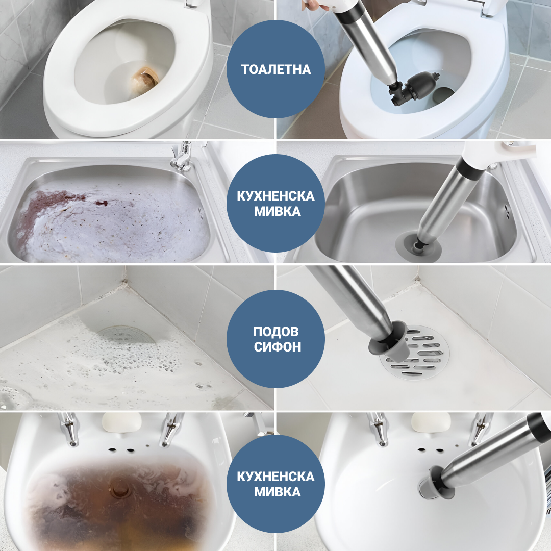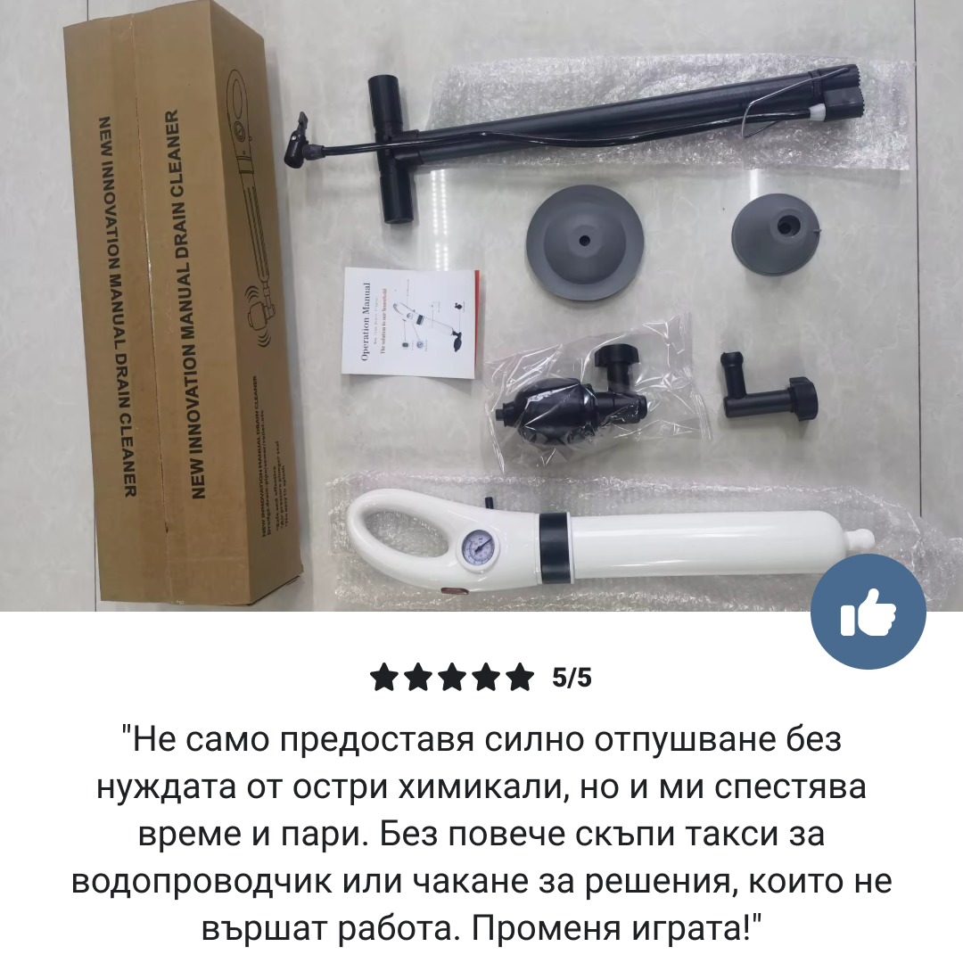 „Имам 3 малки деца вкъщи и винаги ми се струва, че тоалетната е запушена. Обикновеното бутало не работи дори след 3 дни използване без прекъсване. Реших да поръчам този продукт и той работи прекрасно. Настройването му беше бързо и лесно!“