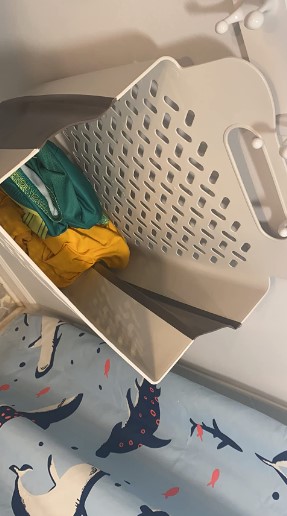 „Нашата вече стара къща няма пространство и място за съхранение. Банята в коридора е достатъчно голяма за три деца, но не за кошница. Когато се разшири, тази кошница може да побере мръсни дрехи за една седмицз за три деца.“