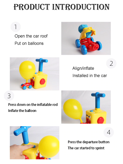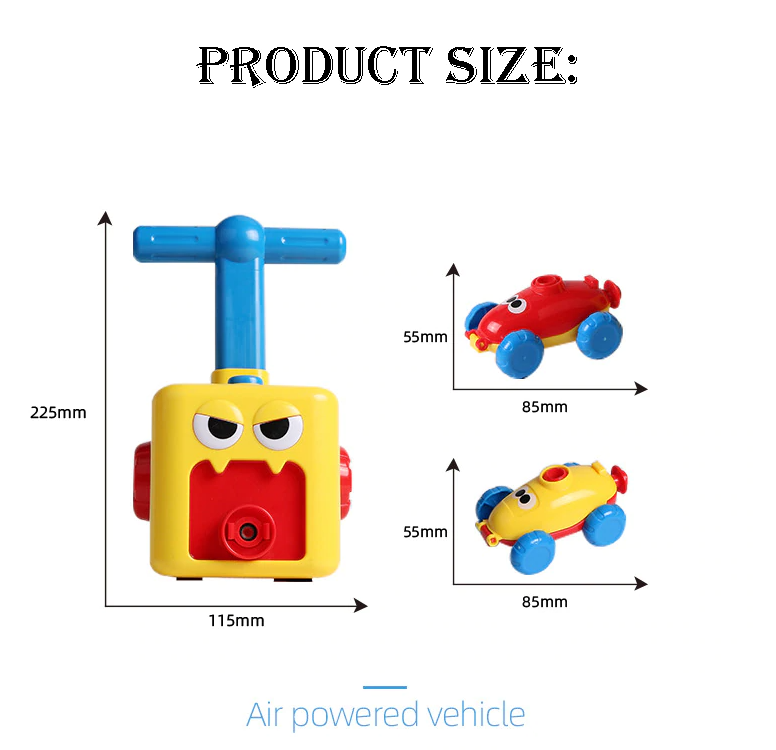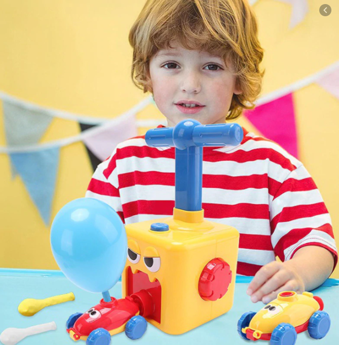 Ранна образователна играчка, която е от полза за физическото и психическото здраве на децата. Колкото повече въздух изпомпвате в балона, толкова по-бързо ще се движи автомобилът, но въздушното съпротивление ще бъде по-голямо.