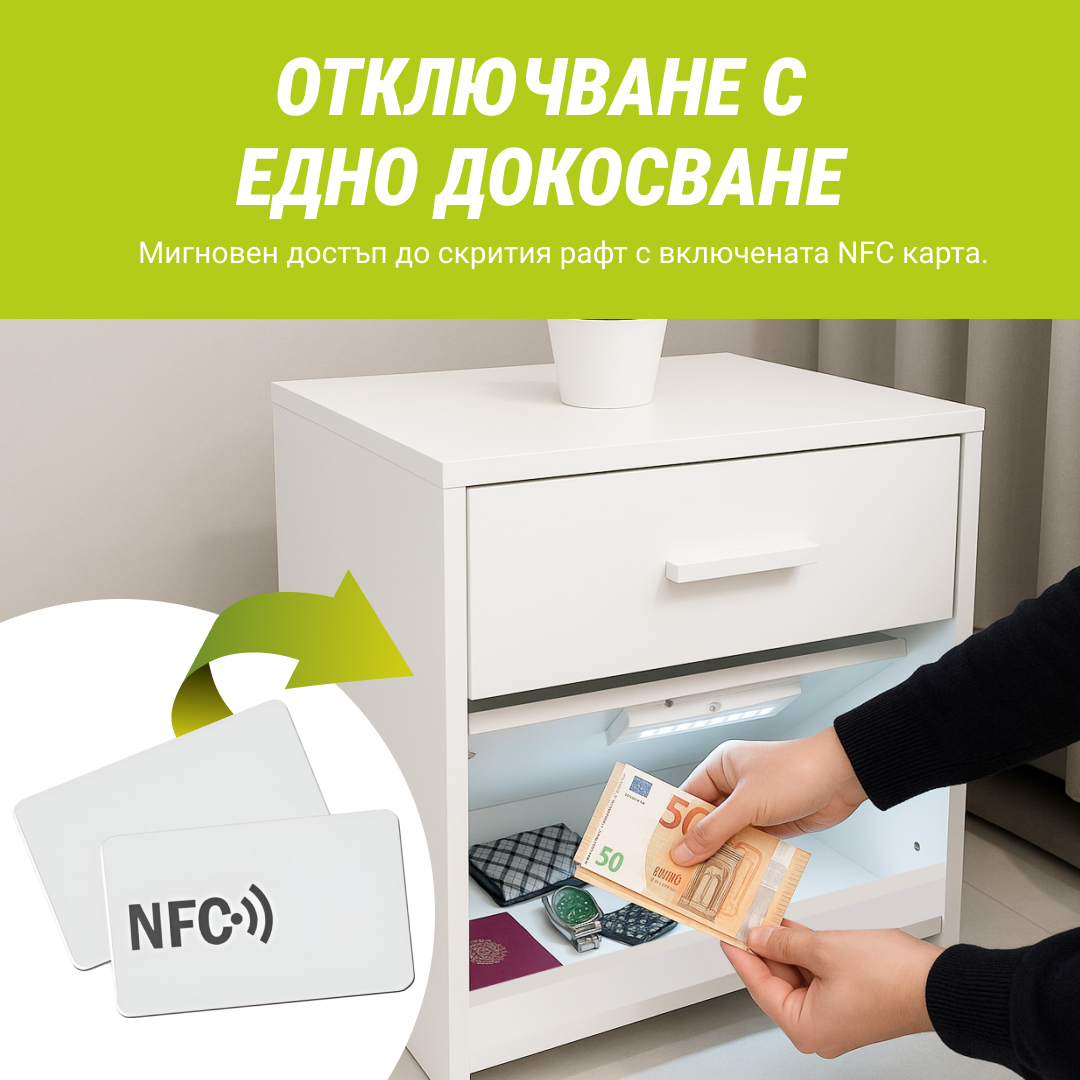 • Интелигентен Достъп – Само едно докосване с включената NFC карта е достатъчно, за да отключите незабавно скритото отделение.