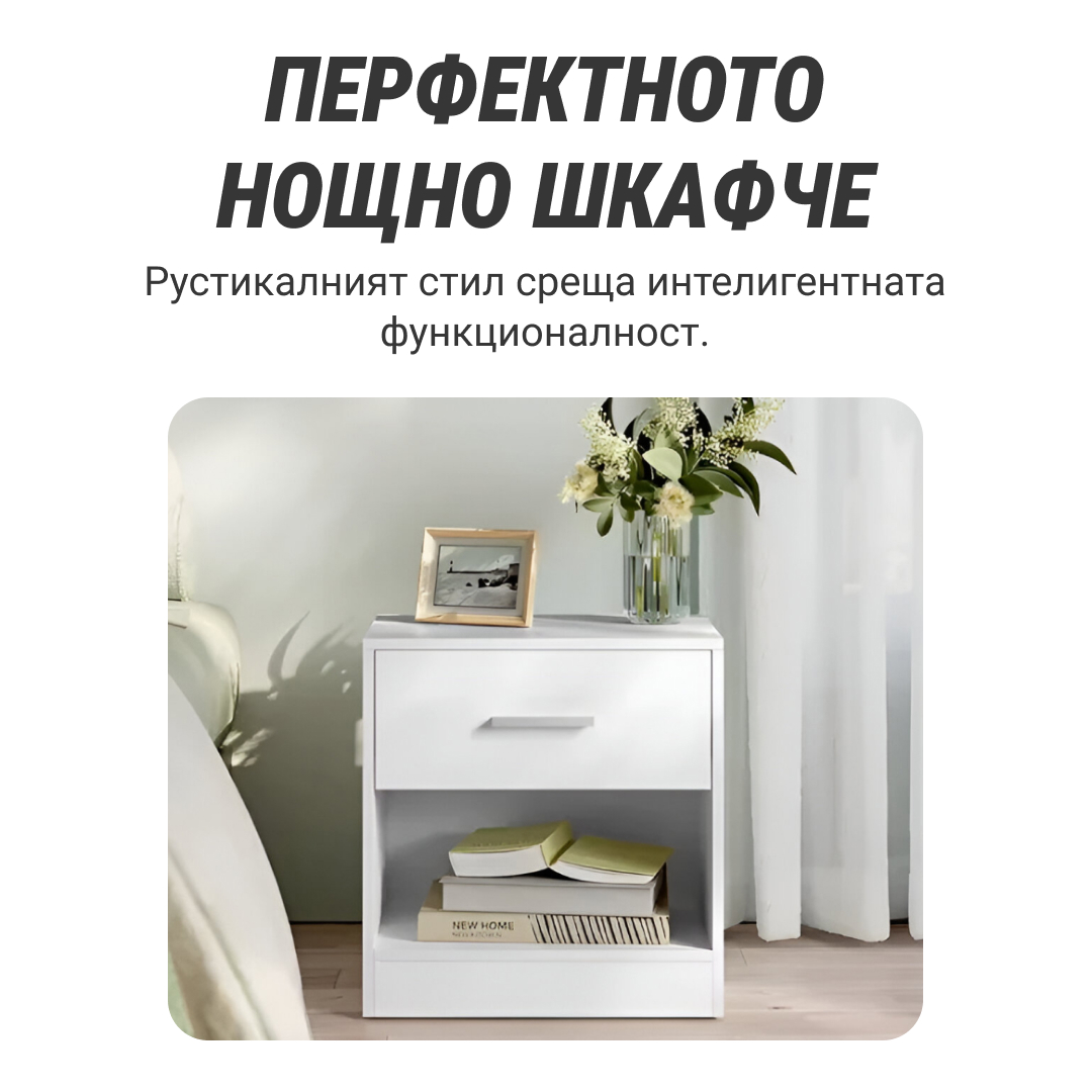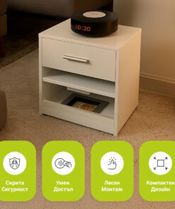 • Елегантно Пространство – Главното чекмедже и отворената полица предлагат място за книги, очила и други ежедневни предмети.