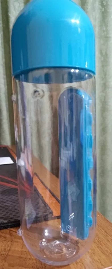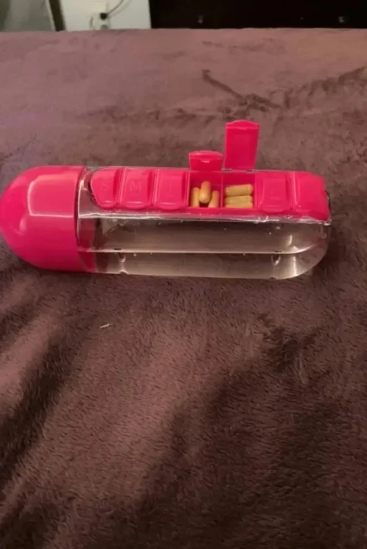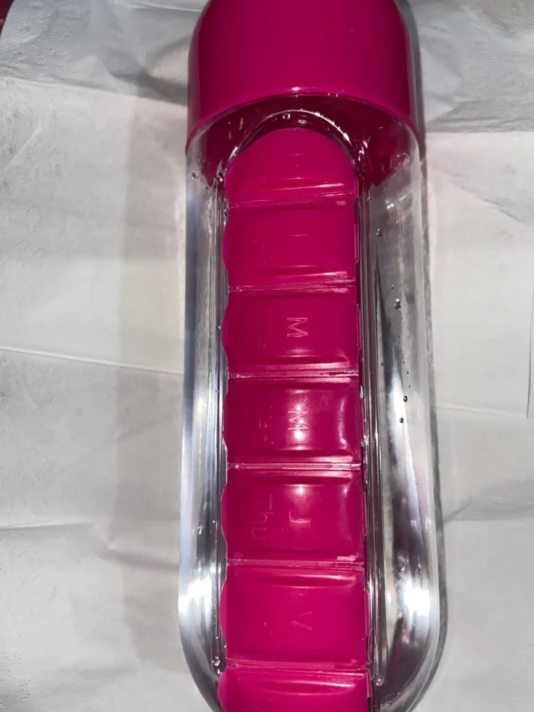 Гениален дизайн! Бутилката съдържа точното количество вода, а държачът за хапчета спасява живот. Пасва перфектно в чантата ми!