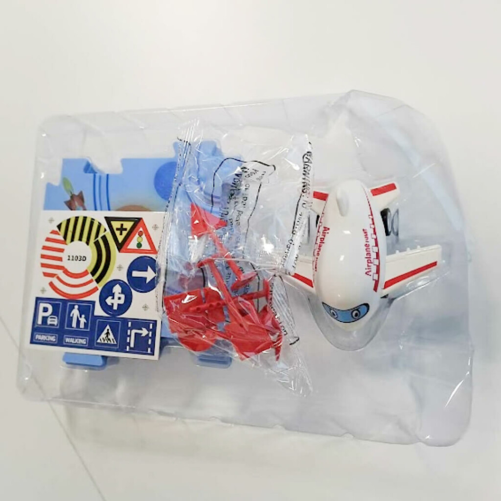 Опаковката съдържа 6 пъзела с размер 13 x 13 см, батерийно захранвано самолетче и 6 пътни знака.