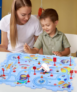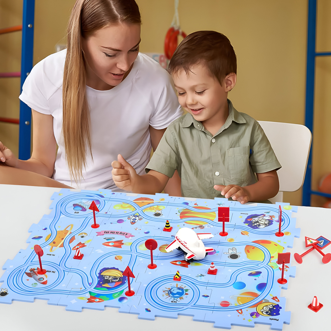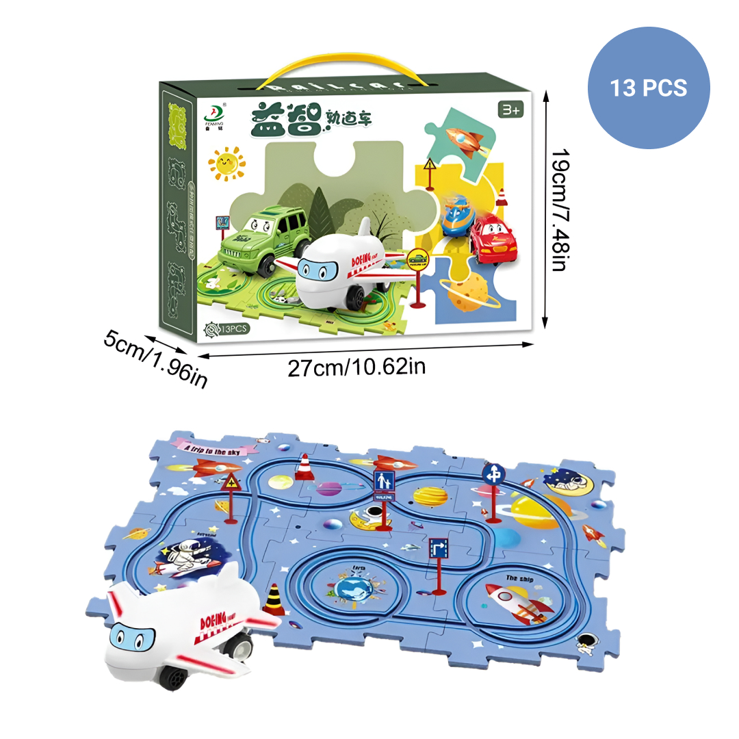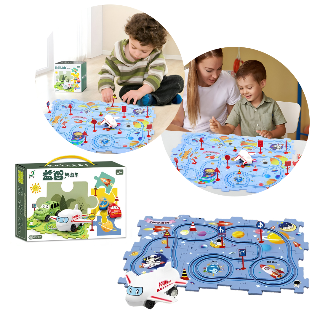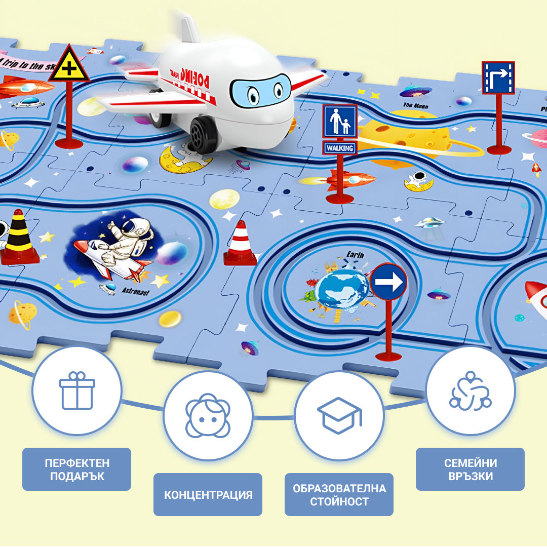 Невероятна играчка на релса, която работи като пъзел: частите могат да бъдат поставени в определен ред, за да може самолетът да следва релсата. Има различни начини за поставяне на пистата, за да се осигури разнообразие и креативност.