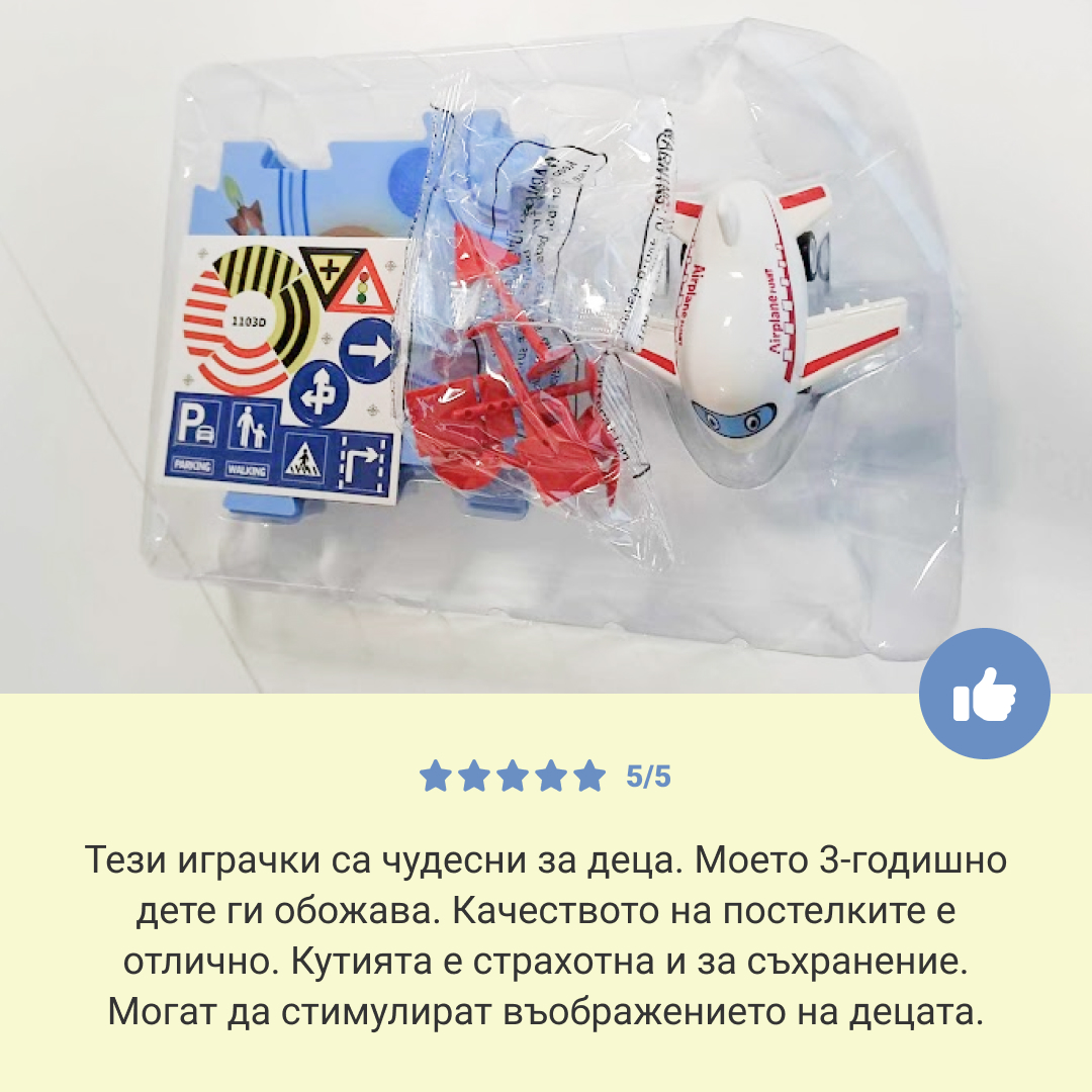 Опаковката съдържа 6 пъзела с размер 13 x 13 см, батерийно захранвано самолетче и 6 пътни знака.