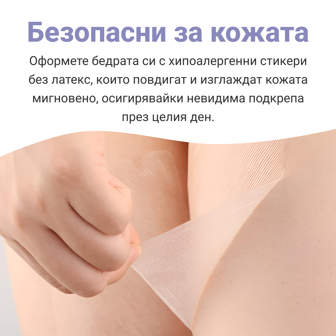 Изпитайте свободата да носите всяко облекло с лекота с нашите дискретни, устойчиви на пот стикери, оформящи бедрата!