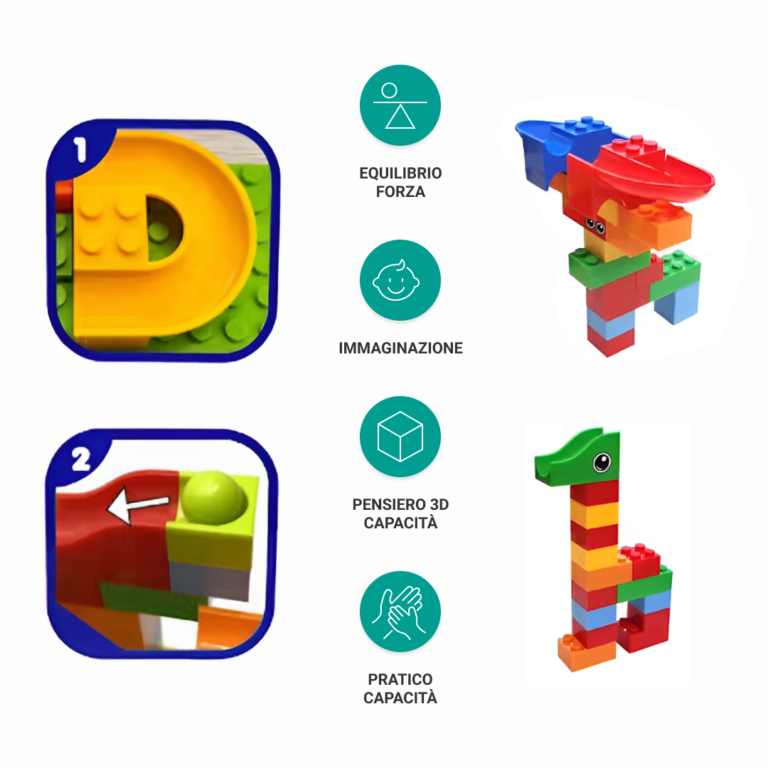 Комплектите блокове ще подобрят сръчността на ръцете, креативността, откривателските способности, координацията ръка-око, разграничаването на цветове и ще просветят тяхното въображение.