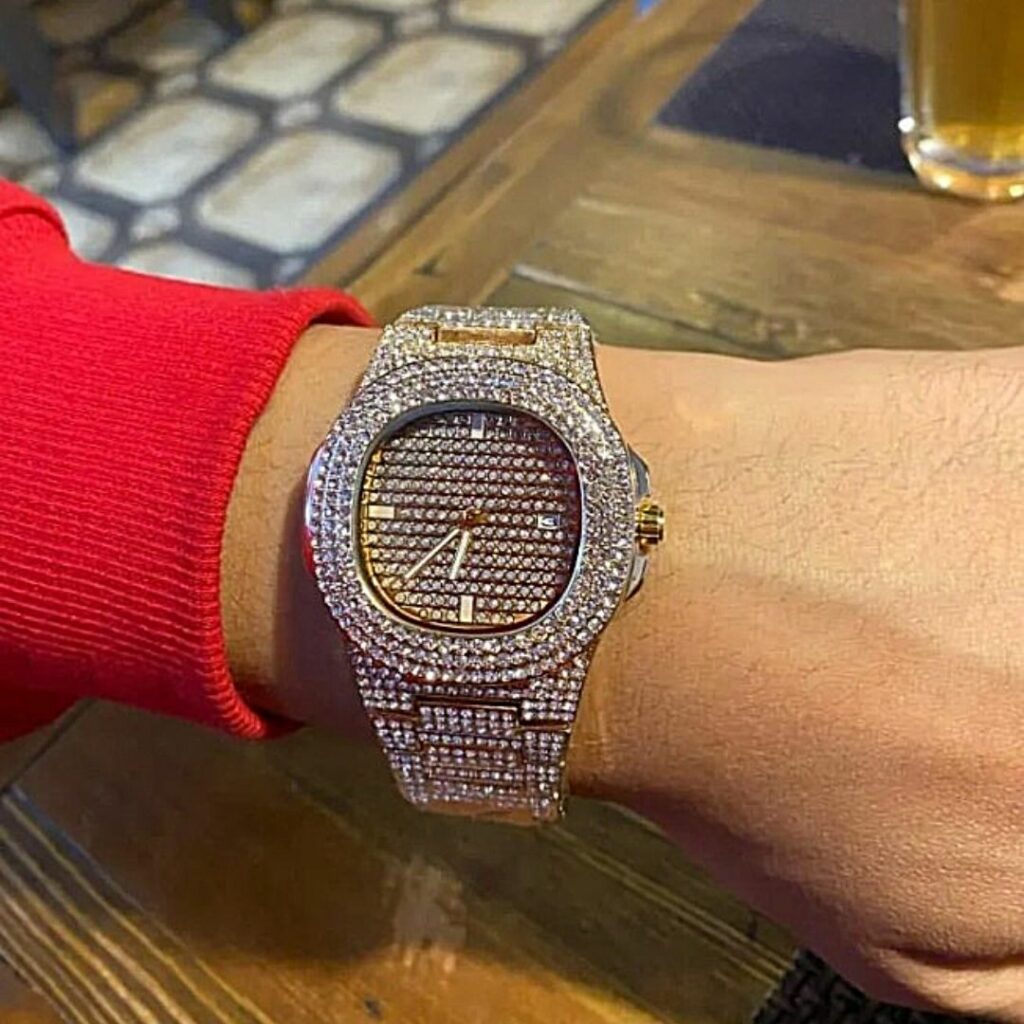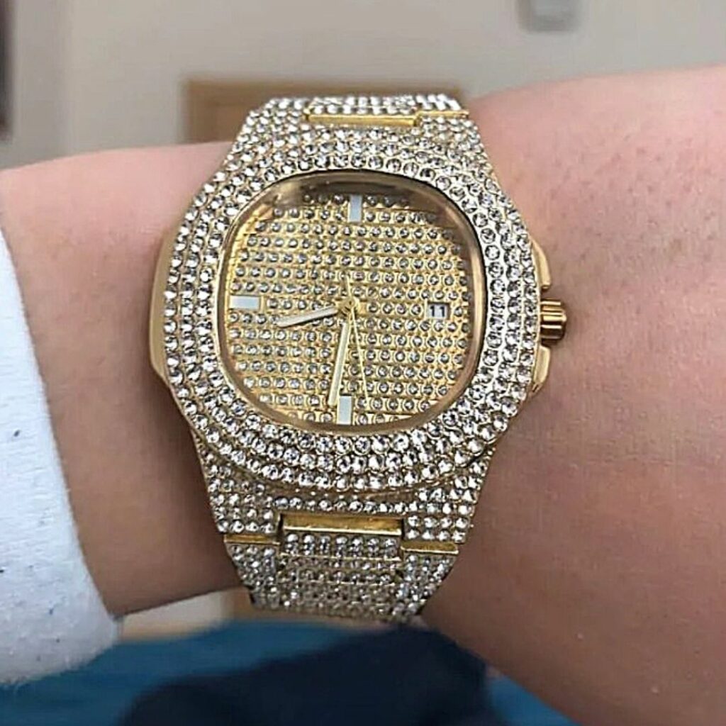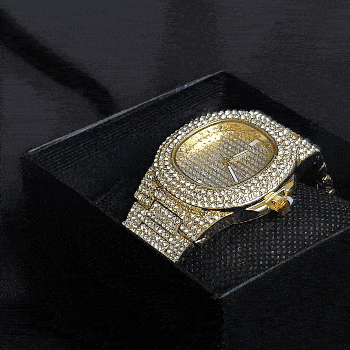 С красиво златисто покритие и декориран със страхотни скъпоценни камъни, този златист часовник е изключително произведение на изкуството.