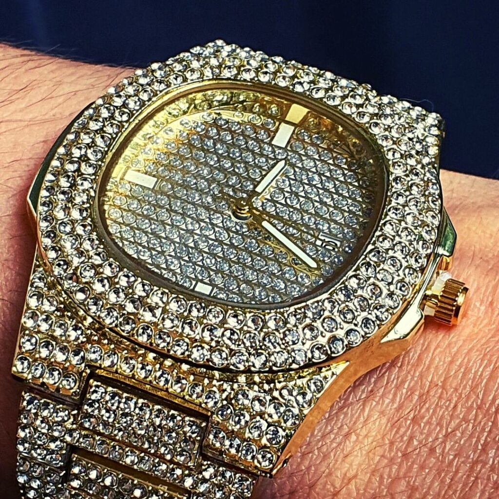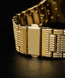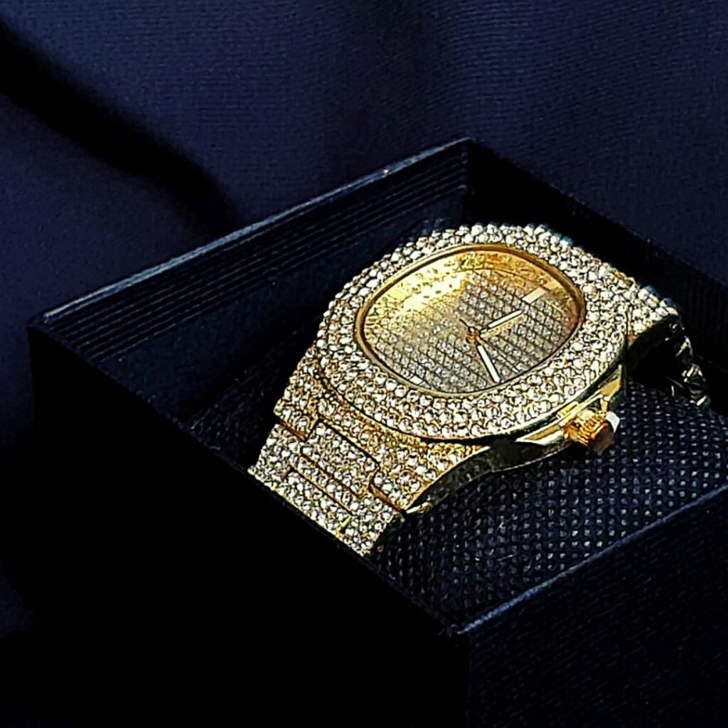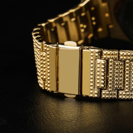 С красиво златисто покритие и декориран със страхотни скъпоценни камъни, този златист часовник е изключително произведение на изкуството.